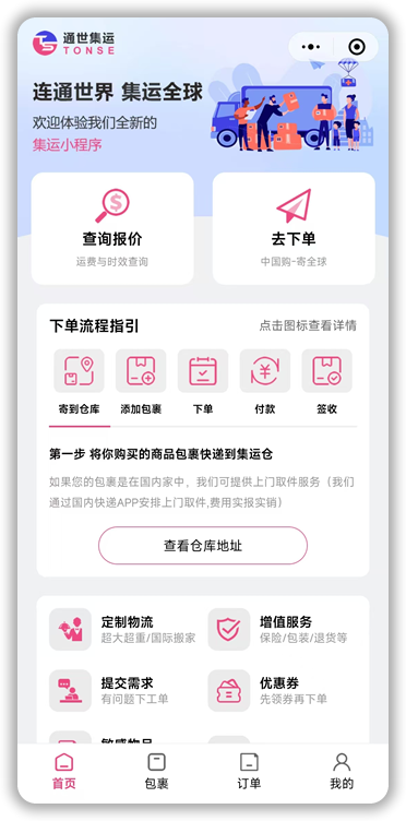 通世集运成立于2005年,是一家专注全球跨境集运为核心业务,集物流、跨境、仓储、配送于 一体的集运服务品牌企业。 提供淘宝、天猫、阿里巴巴、拼多多、京东、抖音等大型网购平 台订单代收包裹、仓储、合包、跨境运输等服务,让您随时随地轻松集运、一目了然管理跨 境网购的包裹!